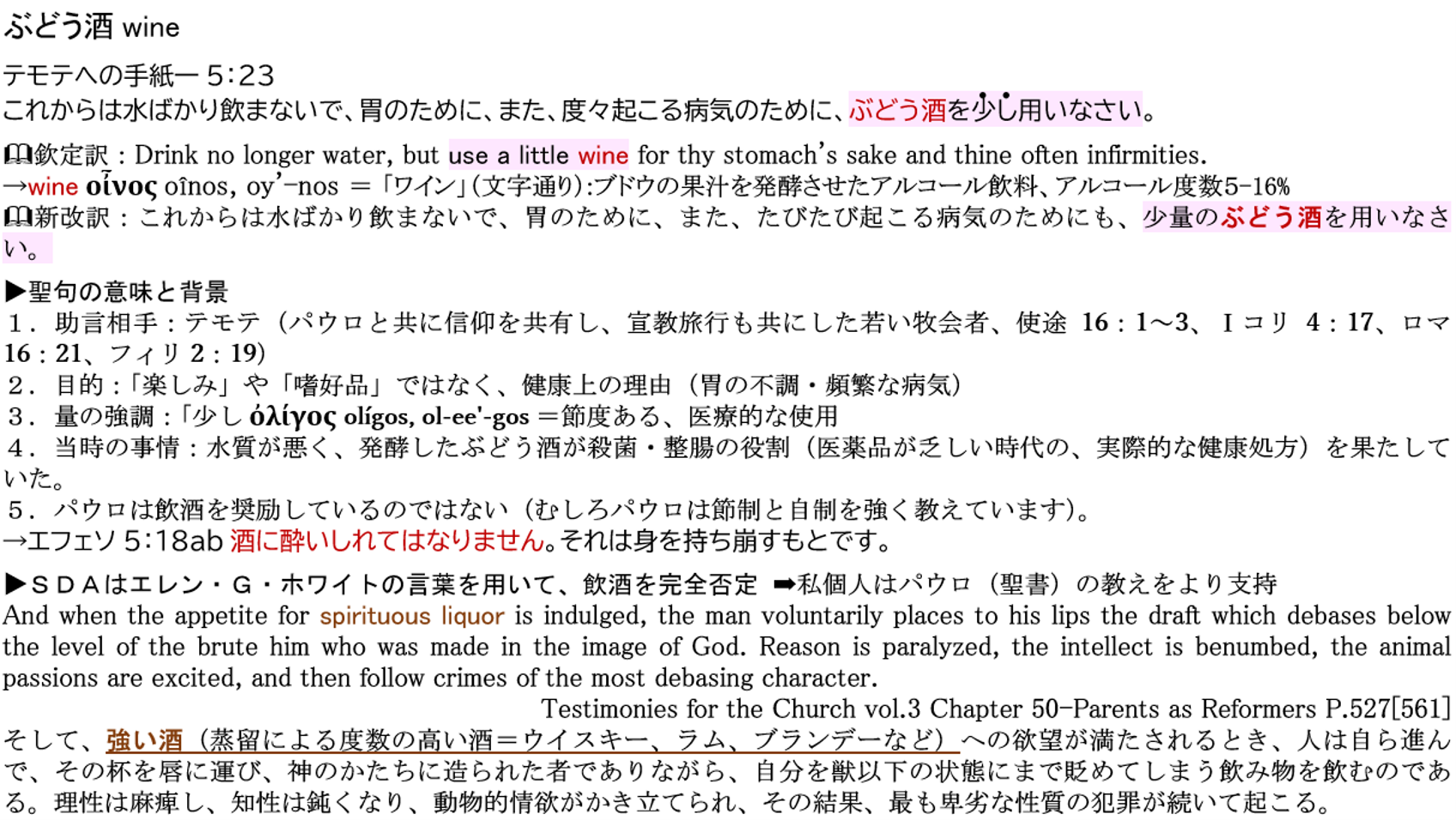㊟1:エレン・G・ホワイトは「強い酒」は否定している。㊟2:上記の「私」は、サイト管理者 谷口 一です。